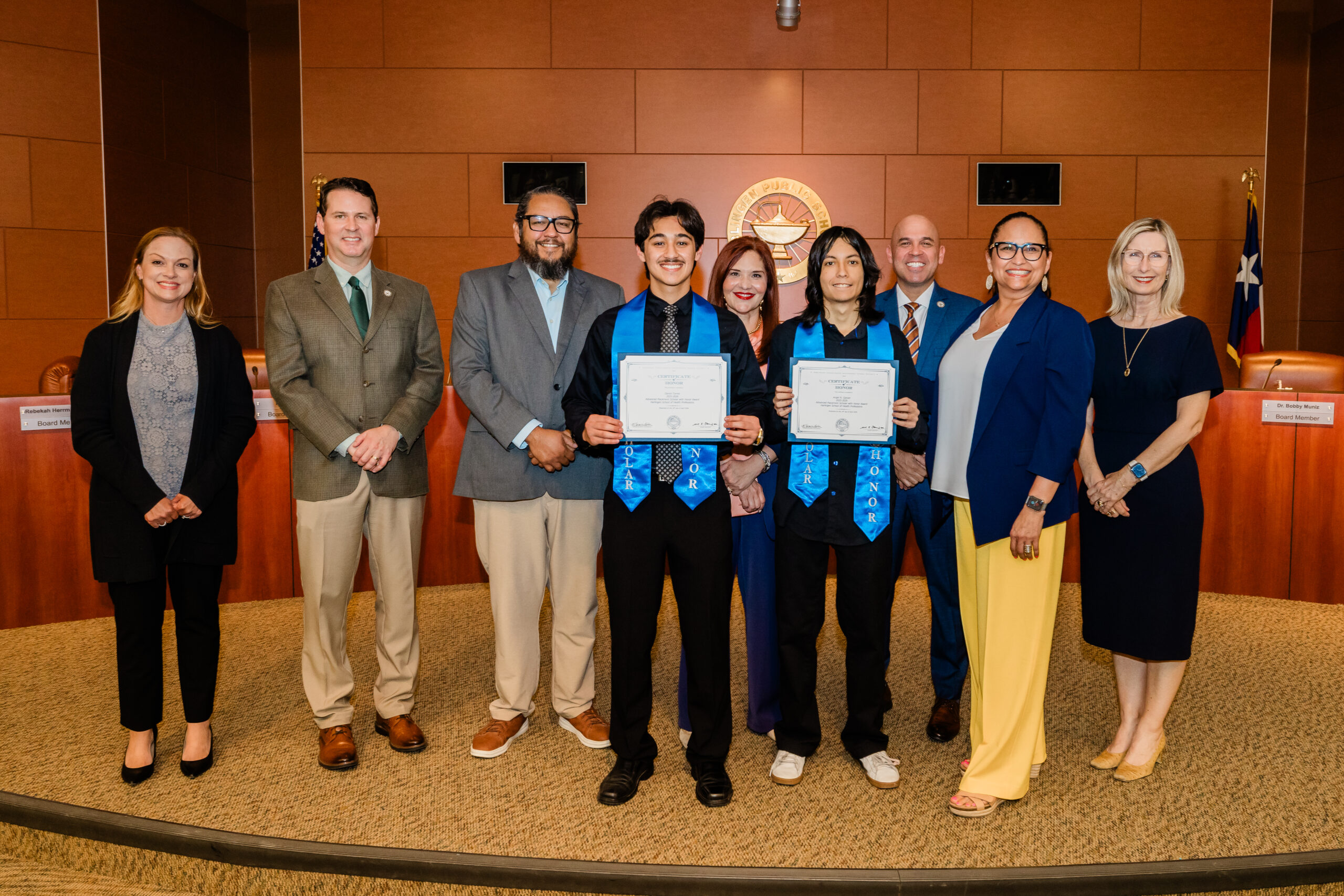 During the April regular Board Meeting, HCISD recognized students who earned AP Scholar honors from the College Board, with several of the honorees, many now attending college, returning to be acknowledged in person. Kevin Garcia, Director of Curriculum, Instruction, and Assessment, presented the students to the Board of Trustees and shared that 118 HCISD students earned AP Scholar recognition this year.
